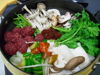 버섯전골-육수붓기 전... 갖은 야채와 버섯, 고기완자까지.ㅋ