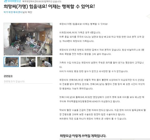 하루 종일 파지를 주우러 다니는 남편과 항상 배고파 하고 학원 한번 다녀 본적 조차 없는 자녀4명이 희망씨의 가족입니다.