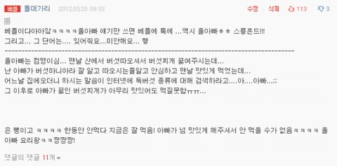 앜ㅋㅋㅋ베플 또 해봄ㅋㅋㅋㅋㅋ 울아빠얘기만 썼다하면 베플에 톡엨ㅋㅋㅋㅋㅋㅋ 아빠짱!!