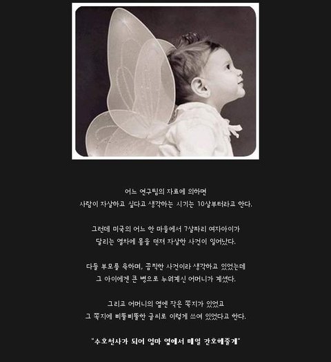 *모바일 배려* 어느 연구팀의 자료에 의하면 사람이 자살하고 싶다고 생각하는 시기는 10살부터라고 한다. 그런데 어느 미국의 한 마을에서 7살짜리 여자아이가 달리는 열차에 몸을 던져 자살한 사건이 일어났다. 다들 부모를 욕하며, 끔찍한 사건이라 생각하고 있었는데 그 아이에겐 큰 병으로 누워계신 어머니가 계셨다. 그리고 그 어머니의 옆엔 작은 쪽지가 있었고 그 쪽지에 삐뚤삐뚤한 글씨로 이렇게 쓰여 있었다고 한다. "수호천사가 되어 엄마 옆에서 매일 간호해 줄게" ------------------------------------------------------------------------------------- 헐 너무 슬프다ㅜㅜㅜㅜㅜ 일곱번째 베플 감사해요.....