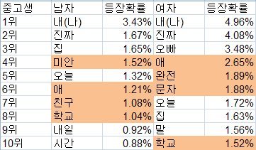 남학생들은 뭐그리 '미안한 일'이 많을까욬ㅋㅋㅋ '미안'이 4위입니다.