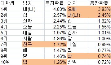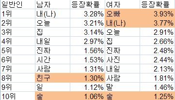 여기서도 역시나, 여자들은 '나'보다는 '오빠'를 더 많이 사용하는군욬