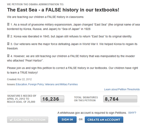 현제 백악관에서 일본해를 동해로 표기한다는 서명운동이 시작되었군요