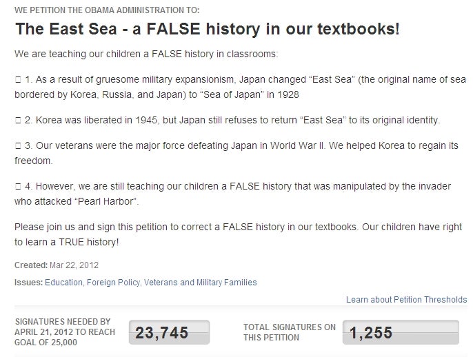 우리나라의 자랑스러운 동해가 일본해라는 이름으로 표기된 지 상당한 시간이 지났습니다 여러분들 중 그것이 아무런 상관도 없다 생각하시는 분들도 계실 겁니다 하지만 우리가 수백년, 수천년동안 불렸던 곳이 다른 나라의 다른 이름으로 전세계 많은 사람들이 잘못 알고 있습니다. 우리가 사는 이 땅은 대한민국이며 우리는 자랑스러운 한국인입니다 일본해가 아닌 우리의 동해를 우리손으로 지킬 수 있는 기회입니다. 부디 이 글을 읽고 다시 한번 생각해주세요