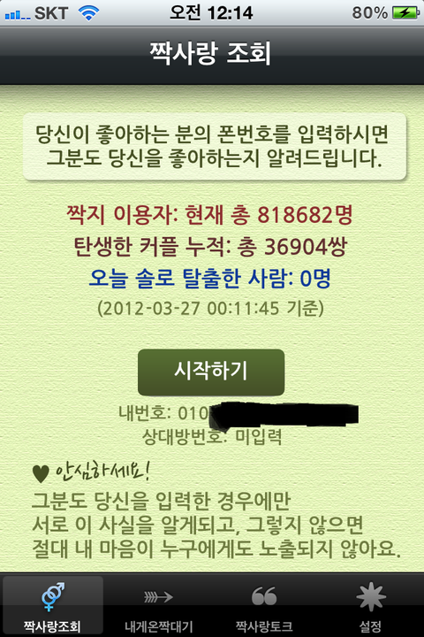 내 번호를 입력하고 내가 좋아하는 사람 번호를 입력하면 상대방에게는 누가 좋아하는지는 알려주지 않고 누군가 당신을 좋아한다고만 뜨는거야