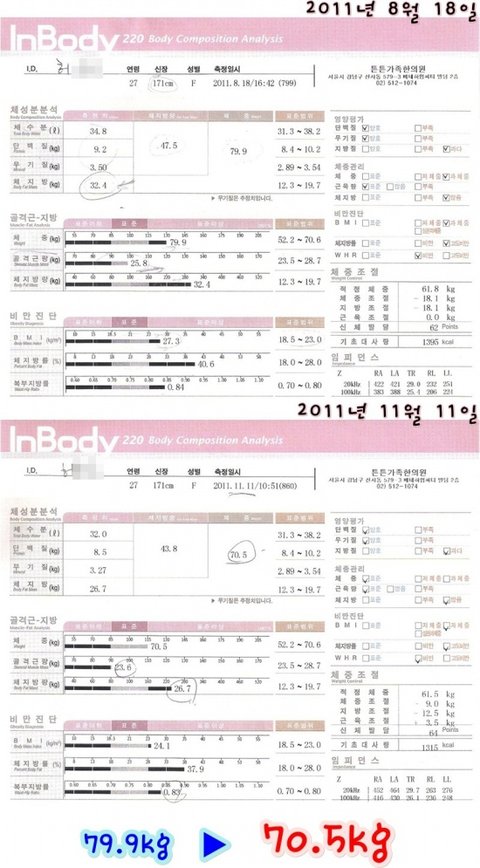 2개월 2일이 지났다. 몸이 한층 가벼워졌고 컨디션이 좋다고 한다. 인바디기계 측정을 해보니 체중이 71.4kg 이다. 그리고 다시 21일 후, 11월 11일 70.5kg 이다. 얼굴이 무척 밝아지고 잘 웃는다. 그녀의 표정에 자신감이 붙었다.