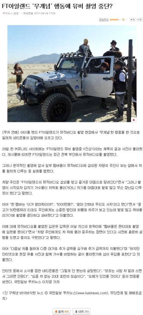 이기사보고 멤버들얘기도 들어보지도않고 차주인말만 믿고 욕하셨자나요..화가너무나서 제가이런댓글을올렸습니다 "멤버들 이야기도 들어보지도 않고 왜 욕부터 하세요?? 이거 감싸는거아니에요!! 여러분들이 만약에 어떤물건을 훔치지도 않았는데 무조건 훔쳤다고하면서 욕부터 하면 기분 나쁘자나요!! 멤버들도 이 악플 보면서 정말가슴아플거에요!! 그러니까 멤버들의 공식적인 얘기가 나오고 결론이나면 그때도 FT아일랜드가 잘못한거라면 그땐욕하세요!! 그땐 잘못을 했으니 욕을먹는게 당연하겠죠!! 그러니까 공식적인 결론이 나기전에 욕은 좀 삼가해주셨으면 합니다!! "