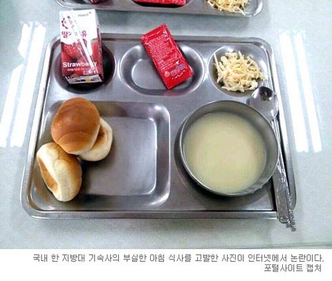 [쿠키 사회] 국내 한 지방대 기숙사의 부실한 아침 식사를 고발한 사진이 인터넷에서 논란이다. 네티즌들은 “많이 먹을 학생들에게 너무 심한 식사”라며 혀를 차고 있다.