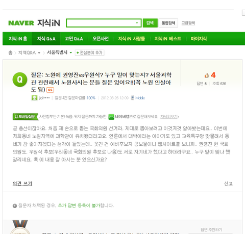 사고가 많이 잘못된 사람 같더군요 ㅡㅡ 그런데 김용민 우원식 노회찬 후보(노회찬후보는 솔직히 불쌍함) 노원에서 야권 연대로 아주 끈끈 하더군요..끼리끼리라고....
