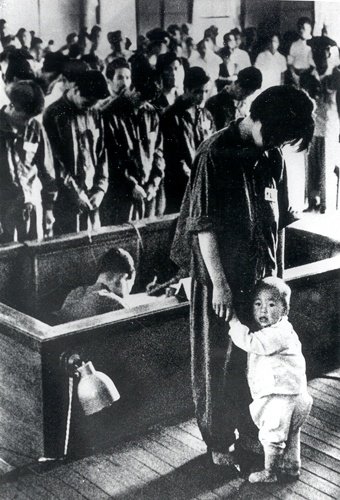재판을 받고 있는 어머니에게 다가가 손을 잡고 있는 아이의 모습.