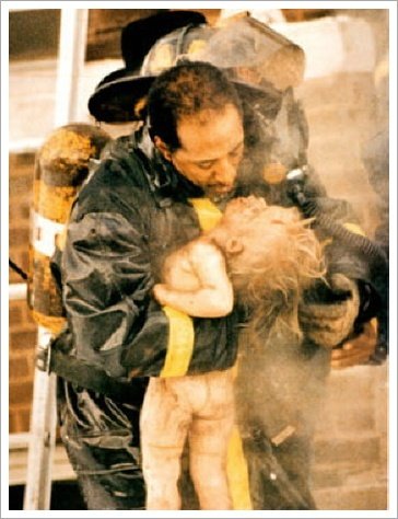 아파트의 화재로 한 소방관이 아이에게 인공호흡을 하고 있다.
