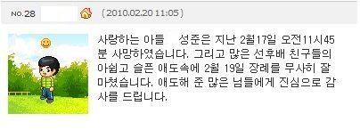 성준이형 잘 지내나? 거긴 편하고? 그러게 왜 죽을때 훈련병때 죽어가지고 저승에서도 이등병 꼬리표 달고 다니나. 거긴 휴가도 없어? 한번쯤 내 주변에 귀신이 되서라도 나타날때 되지 않았나? 각박하네 저승사자도.