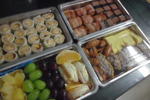 메뉴는 롤샌드위치, 스팸초밥, 베이컨김치볶음밥말이, 계란말이, 비엔나소세지, 유부초밥, 과일임.