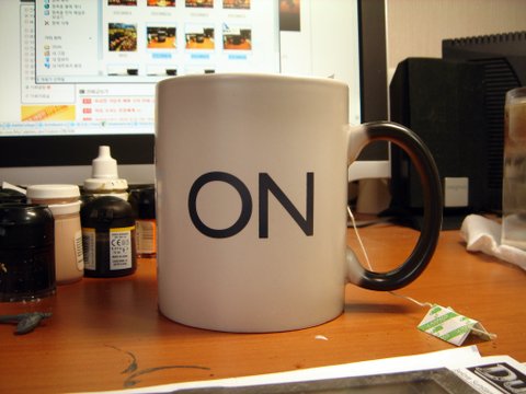 나의 마음을 홀랑 빼앗아갔던 바로 그 ON / OFF 머그컵. 뜨거운 물을 부으면 ON이 보임.