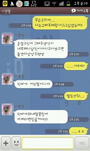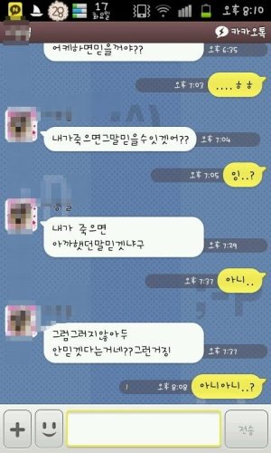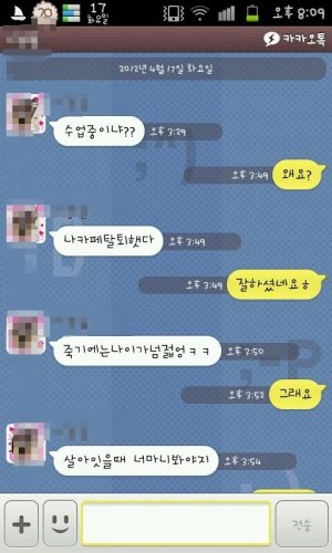 처음에 이선배가 몇년전에 여소해달라고햇는데ㅋㅋㅋㅋㅋㅋㅋ해줫더니ㅋㅋㅋㅋ내친구는 남자친구가잇엇음 ㅋㅋ그래서 친구남친이 연락하지말라해서 한일년간 연락이안왓는데~내친구가헤어지고나서 카톡이오는거임ㅋㅋ깨졋냐고이런식으로 그래서 친구는깨졋다고하니까 갑자기 카톡하다가 자꼬사귀자고 너좋아한다고말하는거임 ㅋㅋ친구가 거절하는식으로얘기햇더니 나는너좋아한다고 아님죽어버린다고하는거에요 ㅋㅋ그래서 자살카페까지가입해서 자살을할려고햇데요ㅋㅋㅋㅋ근데 한동안연락업다가 오늘쩌기위에잇는것처럼 온거에요ㅋㅋㅋㅋㅋㅋㅋㅋㅋㅋ진짜어이없어서......수업시간내내...오글도글ㅋㅋㅋㅋㅋ