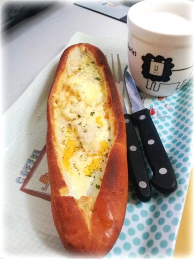 이번엔 좀 길게 잘라서 달걀 깨넣고도 남아서 파낸 빵부스러기로 덮어줌ㅋㅋ