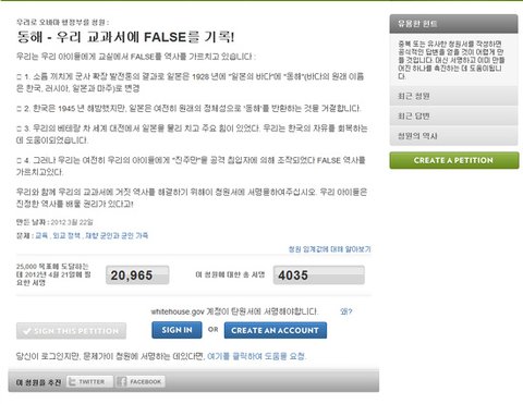 백악관 동해 서명운동이 진행중이에요.