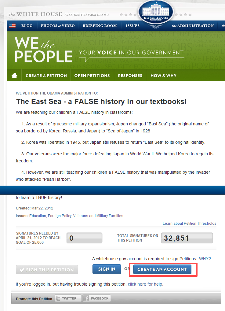 6. SIGN THIS PETITION(서명하기) 누르면 백악관 동해 관련 서명운동에 참여 가능합니다.