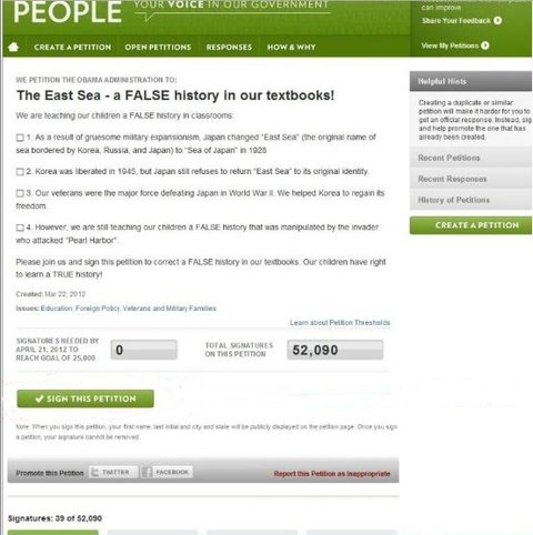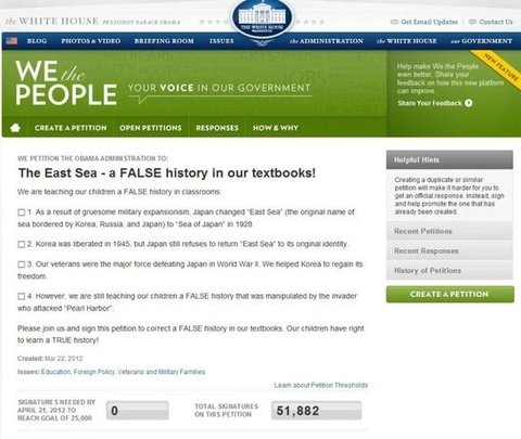 '백악관 투표하면 안됩니다. 투표수가 쌓이면 동해가 분쟁지역이 되어서 우리나라땅이 안되는 데, 일본은 그것을 노리는 것입니다. 왜냐면, 일본은 역사적 근거가 없기 때문입니다. 투표하다가 뺏길 수 있습니다. 국제법정까지 가면 우리는 집니다' 라는 등의 글도봤는데요