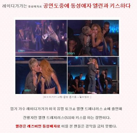 사진에 보시다시피 레이디가가는 엘렌에게 키스를 하고있음.