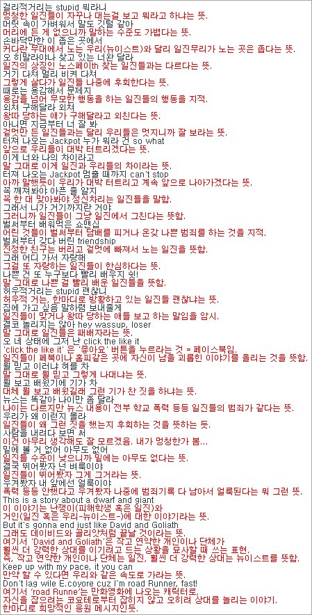 이 부분 을 학교에서 계속 머리속으로 반복재생하고 있었음!근데,,생각해보니까!이 노래가 왕따 학교폭력에 대한 10대들의 관점에서 부른 노래라고한게 생각남손바닥 만한 이 좁은 곳- 교실히말라야-산등산복- 노ㅋ페ㅋ한마디로 등산복인 노ㅋ페ㅋ 를 교실에서 입는 학생들을 가리키는것 아님?나만 이런건가?블락비가 부릅니다-나만 이런거야~ 원래 그런거야?~ (X드립 ㅈㅅ,..)
