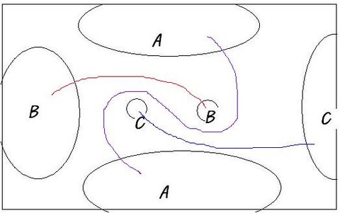 6.A, B, C나라가 있습니다 각국은 자기나라끼리 서로 다리를 연결할려고 합니다.서로 다리가 교차하면 안 됩니다. 어떻게 연결하면 될까요?