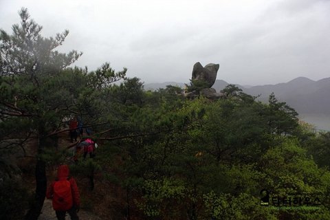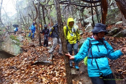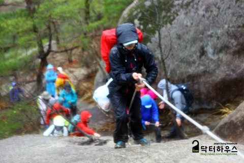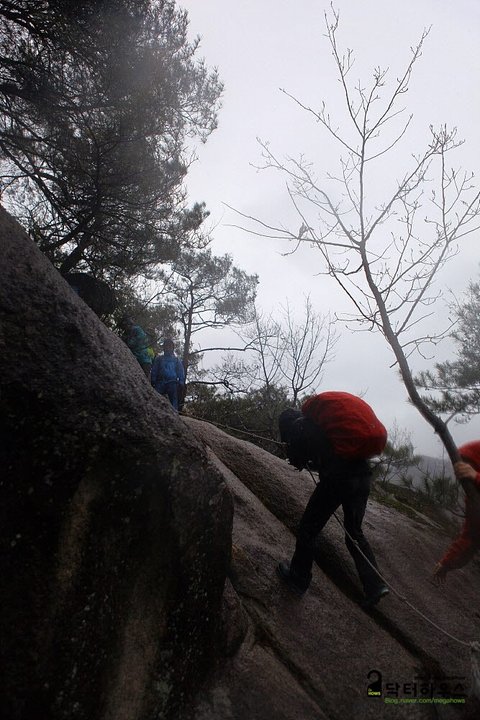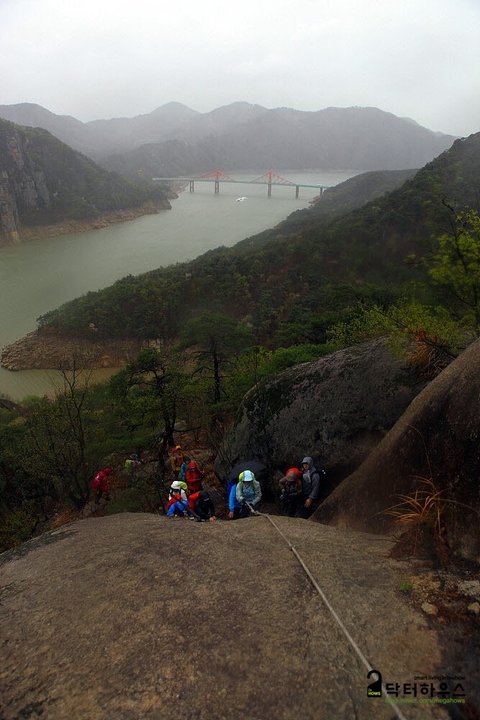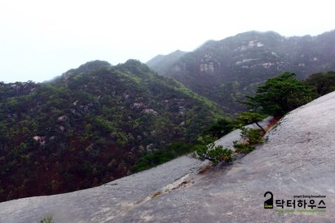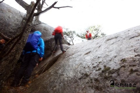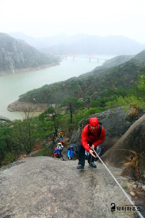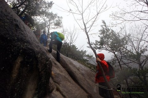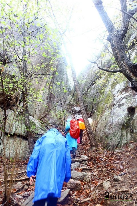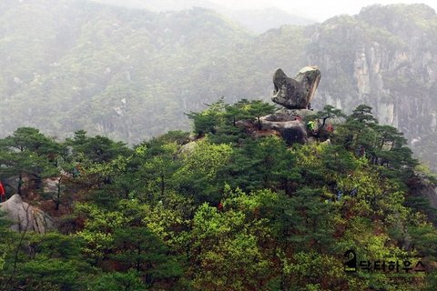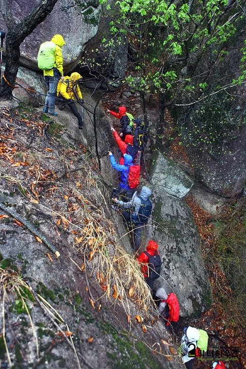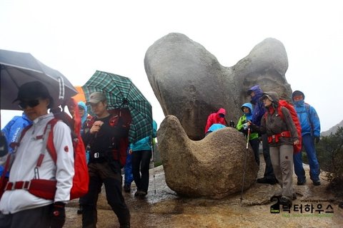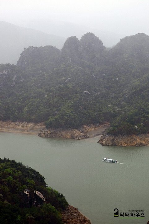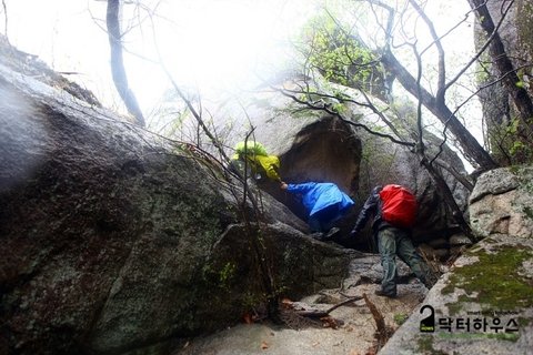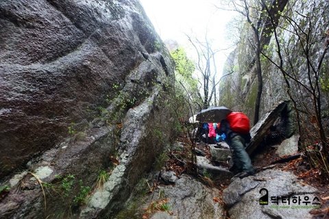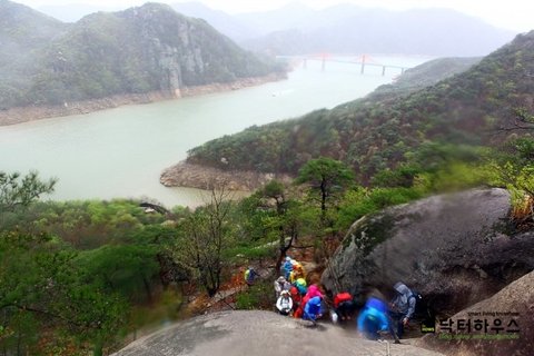 가은산에 올라앉은 새 한 마리 드디어 새 바위입니다. 이 바위는 멀리서 봐도 호기심을 자극하지만 가까이 가면 그 신비함이 최고가 된답니다. 누군가가 산 정상에 큰 바위를 얹어놓고 조각한 것처럼 오묘한 형상의 바위 두 개가 새 모양을 하고 올라앉아 있습니다. 비가 오지만 산행을 즐기는 사람들 저마다 바위를 뒤로하고 인증사진 찍기에 바쁘네요. 가은산은 화강암으로 이루어진 석산이입니다. 덕분에 새 바위를 비롯해 곰 바위, 돌고래 바위, 둥지 바위 등 유명한 바위가 많습니다. 오늘 코스에서는 청풍호가 내려다보이지만 정상에 오르면 남한강이 한눈에 조망됩니다. <신증동국여지승람>에는 ‘군(단양) 서쪽 17리에 있다.’고 기록되어 있습니다. 가은산을 지역주민들은 '가는 산'이라 부릅니다. 옛날 마고할미가 이 산에 놀러왔다가 '이 산에 골짜기가 하나만 더 있었더라면 도성이 들어설 땅인데, 내가 이곳에 눌러앉아 살려고 해도 한양이 될 땅이 못되니 떠난다'고 말하고 떠났다고 해서 가는 산이라는 이름이 생겼다고 합니다. 전설에서 유래한 이름이지만 ‘가는 산’이라는 이름은 내리는 비만큼이나 구슬프네요. 벼락을 맞아 바위가 갈라졌다고 하는 벼락바위를 지나면 로프를 잡고 암릉을 오르는 구간이 나옵니다. 평소에 겁이 없던 이들도 이곳은 미끄러우니 다들 조심입니다. 평평한 곳을 찾아 비를 맞으며 식사를 했습니다. 식사 중에라도 비를 피해보려고 했는데 강풍이 생떼를 쓰며 요란하게 비바람을 뿌리네요. 식사도 잠시, 발걸음을 재촉했습니다. 물이 없는 계곡을 따라 오르는데 여간 미끄럽지 않았습니다. 여러 번 로프를 잡고 암릉 구간을 지나니 왼편으로 구담봉의 자태가 한눈에 들어왔습니다. 내려다보이는 풍광이 아름다워 한참 넋을 놓고 봤습니다. 오를 때는 힘들지만 산행의 즐거움은 이 맛이 아니던가요.