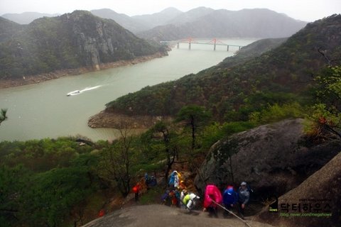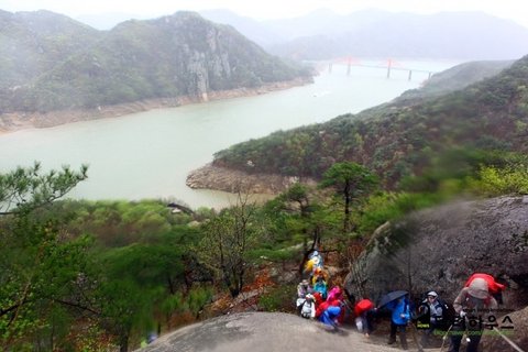 아쉬움 뒤로하고 가는 산 둥지 바위를 지나면서 내리막입니다. 이곳에서는 구담봉 능선을 따라 내려와 청풍호 한 편 끄트머리에 있는 장회나루까지 보입니다. ‘청풍로를 가르는 유람선에 올라 맑은 날 산과 물을 사진에 담으면 얼마나 좋을까’ 생각만으로도 미소가 절로 납니다. 날머리로 향하는 내리막으로 접어들면 암릉 구간이 사라지면서 오롯한 숲길이 나타납니다. 들머리 코스와는 다르지만 흙 내음과 새순 내음, 봄 내음이 그대로 닮았습니다. 처음과 끝이 같은 코스가 마음을 정리하기에 좋습니다. 여름이면 울창한 숲길을 걸으며 나무 그늘에 누워 암릉을 오르며 흘린 땀을 잠시 식히고 가도 좋겠습니다. 올라올 때와 같이 내리막도 가파르지 않습니다. 계단이나 급경사로 이루어져 자칫하면 실족할 수 있는 여느 산의 날머리보다 안전하고 친절합니다. 이 생각 저 생각하며 걷다보니 어느 덧 옥순대교 들머리 길을 만났습니다. 비가 와서 ‘혹시나’ 했던 산행이었는데 기쁜 마음으로 마무리 할 수 있어 좋았습니다.