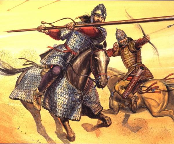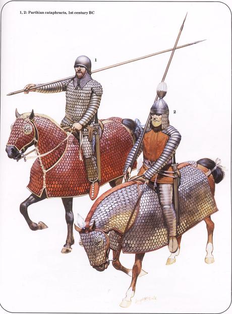 파르티아의 카타프락토이 기병대가 철제 미늘갑주를 말에게 씌우고 돌격하는 중기병을 창설하고