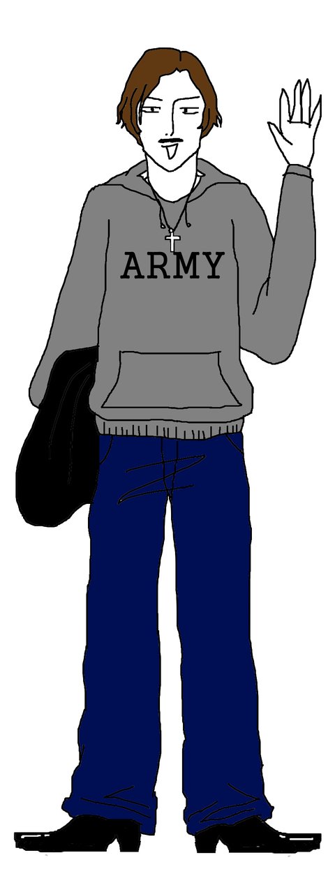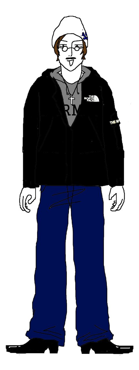통이 엄청 넓은 진청바지, 끝이 뾰족한 까만구두, 십자목걸이, 5:5가르마의 신세대 예수님머리,