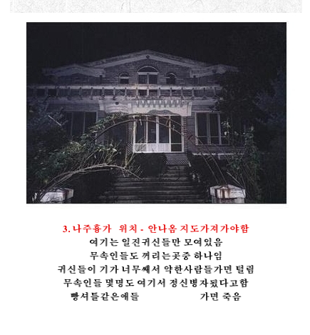 이런 흉가에 절대로 가고 싶지 않겟지만 만약에 가시는 분들이 계시면 주의할 점 몇가지를 알려드리지요: