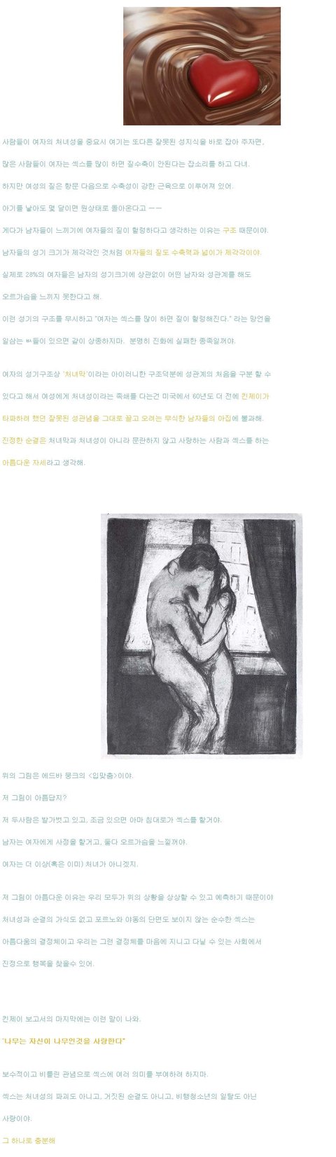 혹시 사랑하는 여자가 다른 사람과 섹스한적이 있기 때문에 싫다는 유치찬란한 생각을 가지고 있는 사람들은 그냥 지금 달려가서 시체기증서에 사인해. 너희들의 뇌는 사용하면 이 세상에 악이되거든. 그냥 의대 신입생들의 해부 실습용으로 이 세상에 빛이라도 만들어야지... 사람들이 여자의 처녀성을 중요시 여기는 또다른 잘못된 성지식을 바로 잡아 주자면, 많은 사람들이 여자는 섹스를 많이 하면 질수축이 안된다는 잡소리를 하고 닫녀. 하지만 여성의 질은 항문 다음으로 수축성이 강한 근육으로 이루어져 있어. 아기를 낳아도 몇 달이면 원상태로 돌아온다고 ㅡㅡ 게다가 남자들이 느끼기에 여자들의 질이 헐렁하다고 생각하는 이유는 구조 때문이야. 남자들의 성기 크기가 제각각인 것처럼 여자들의 질도 수축력과 넓이가 제각각이야 실제로 28%의 여자들은 남자의 성기크기에 상관없이 어떤 남자와 성관계를 해도 오르가슴을 느끼지 못한다고 해. 이런 성기의 구조를 무시하고 "여자는 섹스를 많이 하면 질이 헐렁해진다."라는 망언을 일삼는 ㅄ들이 있으면 같이 상종하지마. 분명히 진화에 실패산 종족일꺼야. 여자의 성기구조상 "처녀막"이라는 아이러니한 구조덕분에 성관계의 처음을 구분 할 수 있다고 해서 여성에게 처녀성이라는 족쇄를 다는건 미국에서 60년도 더 전에 킨제이가 타파하려 했던 잘못된 성관념을 그대로 끌고 오려는 무식한 남자들의 아집에 불과해. 진정한 순결은 처녀막과 처녀성이 아니라 문란하지 않고 사랑하는 사람과 섹스를 하는 아름다운 자세라고 생각해. 위의 그림은 에드바 뭉크의 입맞춤 이야. 저 그림이 아름답지? 저 두사람은 발가벗고 있고, 조금 있으면 아마 침대로가 섹스를 할꺼야. 남자는 여자에게 사정을 할거고, 둘다 오르가슴을 느낄꺼야. 여자는 더 이상(혹은 이미)처녀가 아니겠지. 저 그림이 아름다운 이유는 우리 모두가 위의 상황을 상상할 수 있고 예측하기 때문이야 처녀성과 순결의 가식도 없고 포르노와 야동의 단면도 보이지 않는 순수한 섹스는 아름다움의 결정체이고 우리는 그런 결정체를 마음에 지니고 다닐 수 있는 사회에서 진정으로 행복을 찾을수 있어. 킨제이 보고서의 마지막에는 이런 말이 나와. "나무는 자신이 나무인것을 사랑한다." 보수적이고 비틀린 관념으로 섹스에 여러 의미를 부여하려 하지마. 섹스는 처녀성의 파괴도 아니고, 거짓된 순결도 아니고 비행청소년의 일탈도 아닌사랑이야. 그 하나로 충분해.