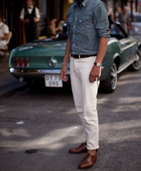 블루 계열의 셔츠와 화이트 팬츠, 가죽벨트는