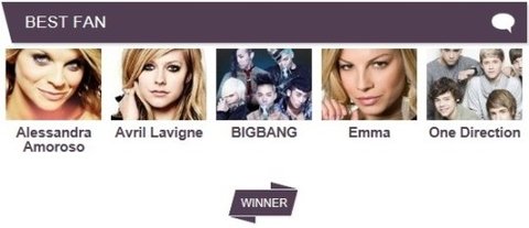 세계적인 팝 스타 에이브릴라빈, 저스틴 비버 5명이 모여있다고 해도 과언이 아닐 최고의 아이돌 원디렉션과 함께 후보에 올랐습니다.