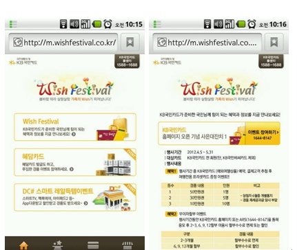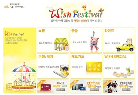 http://www.wishfestival.co.kr/main.asp위에 있는 링크가 바로 위시페스티발 사이트 주소인데요.위시페스티발은 이름처럼 고객들의 Wish를 채워 줄다양한 이벤트를 모아놓은 KB국민카드의 캠페인이라고 하네요.진행중인 이벤트를 쭈욱~ 살펴보니 소셜커머스, 홈쇼핑 할인, 캐시백 등등혜택의 종류가 엄청 다양하던데요!?^_^