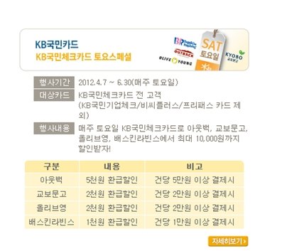 20대의 필수품, 체크카드 이벤트도 진행중입니다.4월 7일부터 6월 30일까지 매주 토요일마다!아웃백, 교보문고, 올리브영, 배스킨라빈스에서 KB국민체크카드로 결제하면금액에 따라 최대 10,000원까지 할인!정말, 저에게 꼭 맞는 이벤트가 아닌가요!?날씨도 좋은데~ 이번주 토요일은 꼭 밖에 나가야겠어요!