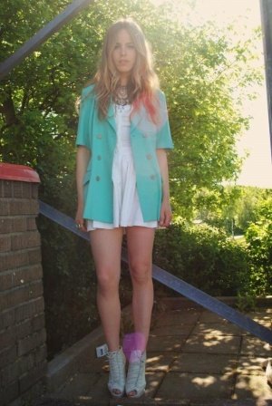 화이트 원피스에 에메랄드컬러의 반팔재킷!