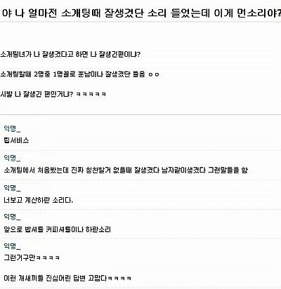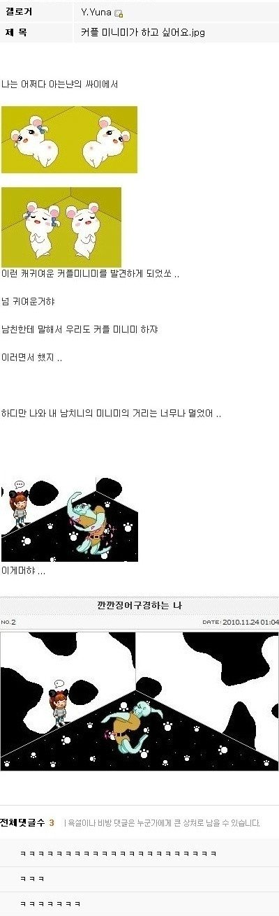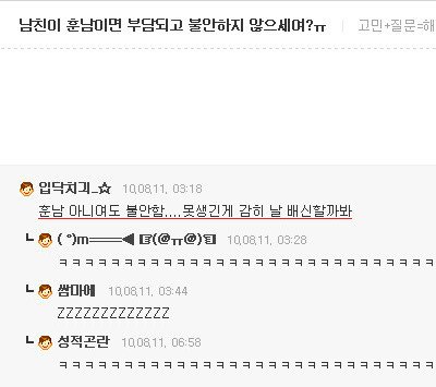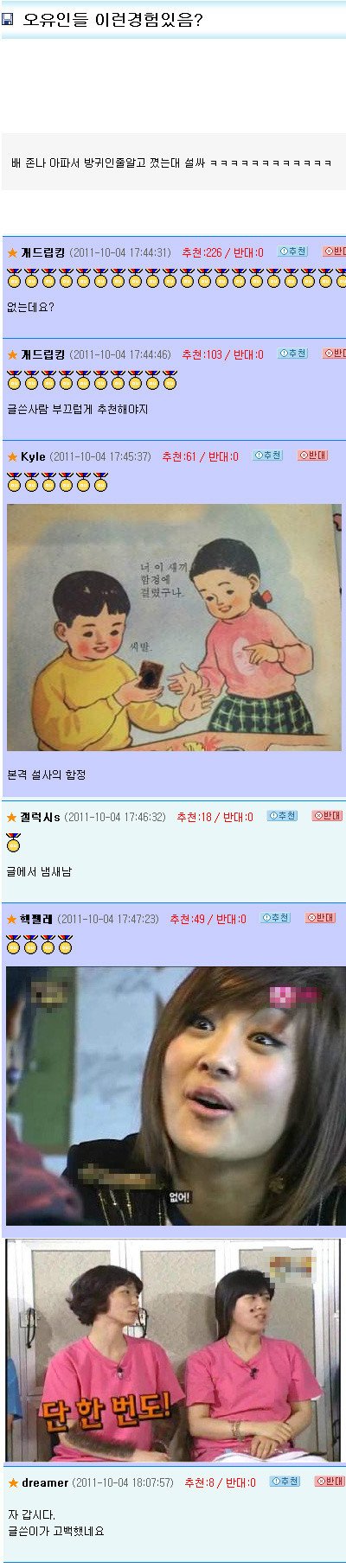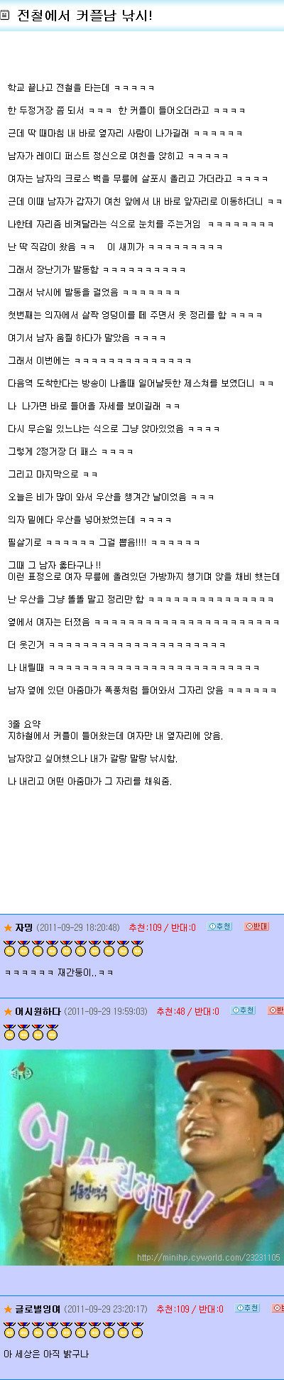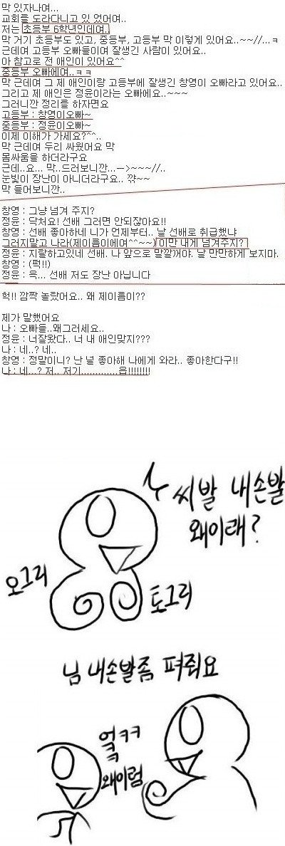 나 지금 알바중임.. 한가해서 사장님 옆에서 야구중이심.. 사장님 아는 동생분 놀러오심.. 나 정신없이 웃음 참으며 글읽음.. 옆에서 동생분이 나 부름.. "아 잠깐만여, 이거 조카 웃겨옄ㅋㅋㅋㅋㅋㅋ ............................................................" 뒷얘기는 상상에 맞겨요.. 힌트를 드리자면.. 이 댓글은 모든 글을 읽고 약 40분뒤에 올립니다..