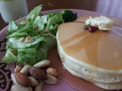 핫케이크는 항상 팬을 달궜다가 무조건 약불로줄인후에 기름한방울과 구워주셔야 저런 색감이 나옴!