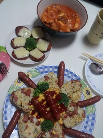 한쿸의 정서를 알려주기위해 양념치킨도 만들고 분홍땡땡소시지도 넣어서 만듬! 보답은 필요없어!