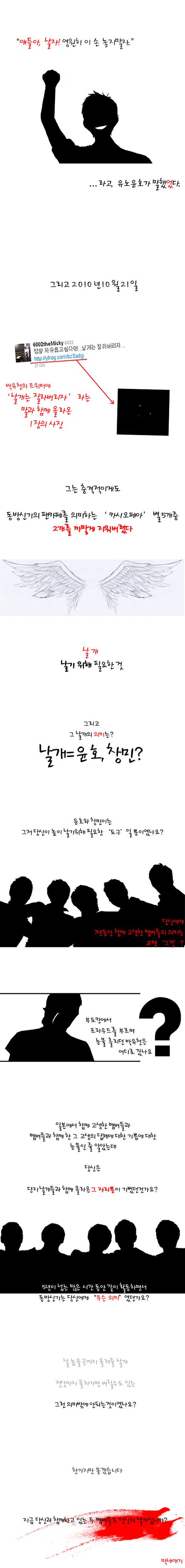동방신기 사태는 애초에 중립이란 존재할 수 없는 사건이다. 중립은 암묵적으로 가해자의 손을 들어주는 거라는 거 유애루비 자칭 올팬들 제발 좀 깨달았으면 좋겠다. 그렇게 사랑하는 내 스타면 적어도 진실을 알려는 노력은 해라. 진실을 알고나서도 세명을 못 버려서 jyj팬이 된다면 그건 개취니 상관안한다. 근데 알아보려는 시도조차 안해봤으면 우리보고 개인팬이니 뭐니 욕할 자격 없다.(라는 다음텔존댓글)
