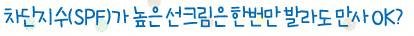 A1. (X) 자외선 차단제는 차단지수(SPF)가 높을수록무조건 좋다고 생각하는 분들이 많은데요,SPF 수치가 높다고 해서 더 오랫동안 자외선을 차단하는 것은 아니며, 많은 빛을 차단할수록 SPF수치가 높은 것이랍니다!따라서, 높은 차단지수만 믿고 하루 딱 한번 바르는 것보다틈틈이 쉽게 발라줄 수 있는 제품을 사용하는 것이 더 효과적입니다!