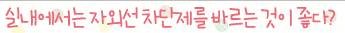 A8. (O)자외선 차단제를 외출 시에만 바르는 경우가 많죠?실내에서도 형광등, TV, 컴퓨터 모니터 등에서 생활 자외선이 소량 발생하기 때문에 발라 주는 것이 알흠다운 얼굴을 지키는 똑똑한 노하우!완벽하게 자외선을 차단하려면 밖에서도 안에서도 자외선 차단제,잊지 말고 꼭! 발라 주세요!
