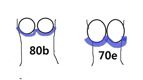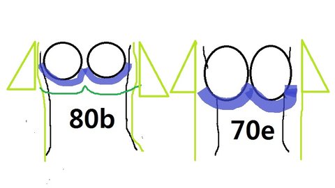 상식적으로 어떻게 B가 E보다 크냐?고 반문할 사람들을 위해 발그림을 그려봄... 저 티셔츠는 기성복임! 공장에서 찍어내는 옷, 즉 직접 제작하거나 맞추지 않는 한 모두 기성복일텐데 왜 그렇게 표현하느냐하면 일반적으로 입는 기성복은 평균적인 인체 사이즈에 기반한 것임 그렇기에 밑가슴 둘레가 80인 사람에게 맞추는 것임. 밑가슴둘레가 80이더라도 약간 넉넉한 것을 감안하면 70인 사람에게는 쫄티가 아닌 이상 그냥 티셔츠는 공간이 많음! (연보라색 공간과 화살표 참고)