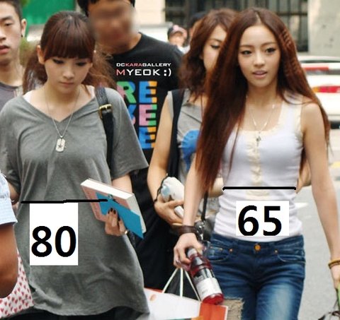 차이를 확연하게 드러내기 위해 과장도 있음... 여기서 주목할 것은 티셔츠의 선! 80은 상대적으로 덩치가 있기에 쫄티나 나시 아닌 티셔츠에도 몸의 윤곽이 드러남 고로 볼륨감이 있어보임! 반면에, 70은 자신의 얇은 허리에 비해 티셔츠는 크기로 인해 슴가는 안에 고히 묻어둔 채(ㅋㅋㅋ?) 절벽인마냥 겉으로 윤곽이 잘 드러나지 않음. 그래서 70은 박스티 등 헐렁한 옷입으면 컵크기에 무관하게 절벽으로 치부됨 ㅜㅜ