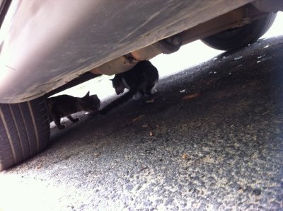 참치를 주니까 차밑으로 가져가서 먹고 있는거예요..(참치는 되도록 주면 안됩니다 입맛도 까다로워지고 치석이 생기는 원인입니다, 약을 먹여야 하는 경우가 아니라면 주지마세요)