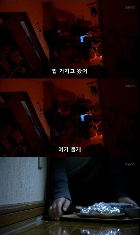 여주의 식사를 가져다 주는 가족들. 여주는 식사마저도 방에서 혼자 먹는듯함.