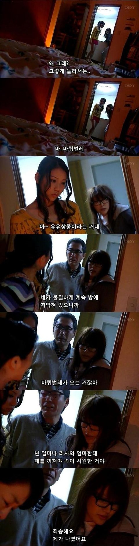 여주의 비명에 한걸음에 달려오는 가족들. 그 비명이 바퀴벌레때문이었다는 것을 안 여주의 동생은 불결하게 방에만 쳐박혀있으니깐 바퀴벌레가 온다하고, 이어서 여주의 아버지는 얼마나 폐를 끼칠꺼냐고 타박을 줌.