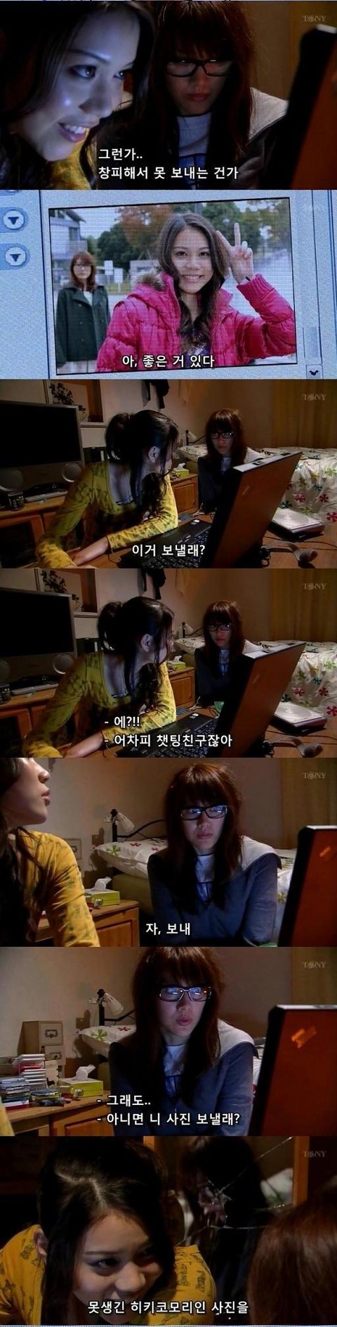 사진을 보내달란 말에 동생의 사진을 보낼까, 못생긴 히키코모리인 자신의 사진을 보낼까 고민하는 여주.