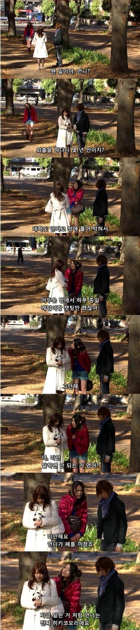 우연히 만난것처럼 연기에 들어간 여주동생은 별것 아니라는듯 여주가 히키코모리이라는 사실을 술술 얘기함. 아... 진짜 얄미움